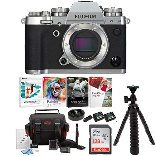 - BUNDLE INCLUDES: Fujifilm X-T3 Mirrorless Digital Camera Body (Silver) with 128GB SD Card, Two Battery and Charger for NP-W126, Focus DSLR Accessory Kit, Focus Flexible 12" Spider Tripod and Corel Deluxe Photo Software Kit