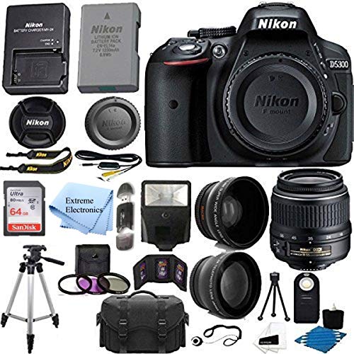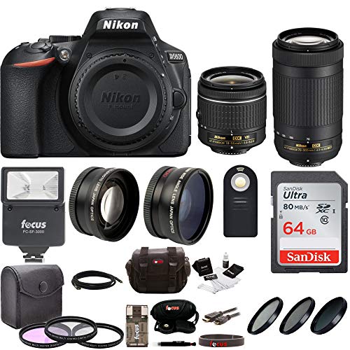 - BUNDLE INCLUDES: Nikon D5600 DSLR Camera with 18-55mm f/3.5-5.6G VR and 70-300mm f/4.5-6.3G ED lenses, Digital Slave Flash, SanDisk Ultra 32GB Memory Card, 55mm 3-Piece Filter Kit, 58mm 3-Piece Filter Kits, 55mm 2-Piece Wide and Tele Lens Set, Universal Wireless Shutter Release, HDMI To Mini-HDMI 6-Feet Cable, and Digital SLR Camera Accessory Kit