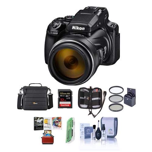 - Nikon COOLPIX P1000 Digital Camera - AN-DC3 Strap - UC-E21 USB Cable - EN-EL20a Rechargeable Li-ion Battery - EH-73P AC Adapter/Charger - LC-77 Snap-On Lens Cap - HB-CP1 Lens Hood - Nikon 1 Year Warranty - Camera Case - 32GB SDHC U3 Card - 77mm Filter Kit - Cleaning Kit - Card Reader - Memory Wallet - Mac Software Package