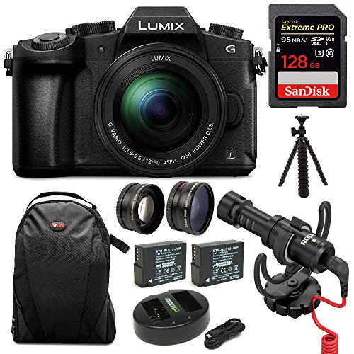 - BUNDLE INCLUDES: LUMIX G85 Mirrorless Camera Body, G VARIO 12-60mm Lens, 128GB Extreme PRO SDXC UHS-I Memory Card, On-Camera Mic with Shock Mount, Battery (2-Pack) and Dual USB Charger for Panasonic DMW-BLC12, 58mm 2-Piece Wide & Telephoto Lens Set, Flexible 12" Spider Tripod, and Photo and Video Backpack
