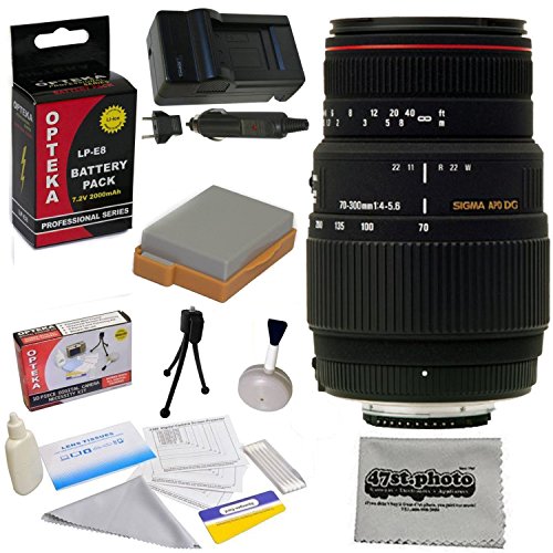 - Package Includes: Sigma 70-300mm f/4-5.6 APO DG Macro Motorized Telephoto Zoom Lens With 3 Year Extended Lens Warranty For the Canon EOS T2i T3i T4i T5i DSLR Cameras Includes 3 Piece Pro Filter Kit (UV, CPL, FLD) + Replacement Battery Packs for the Canon LP-E8 2000MAH + 1 Hour AC/DC Battery Charger + Remote Control + Deluxe Lens Cleaning Kit + LCD Screen Protectors + Mini Tripod + 47stphoto Microfiber Cloth