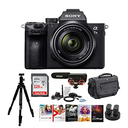- BUNDLE INCLUDES: Sony Alpha α7 III Full Frame Mirrorless Camera with 28-70mm Lens, Koah Shotgun Video Microphone Professional On Camera Mic, SanDisk Ultra 128GB SD Card, Koah Sony NP-FZ100 Two-Pack Rechargeable 2000mAh Battery and Dual Charger, SwissGear Zinc DSLR Camera Messenger Bag, Focus Accessories for 260 Bag, Dolica AX620B 62-Inch Proline Tripod and Ball Head and Corel Deluxe Premium Photo Software Kit with New Photo Mirage